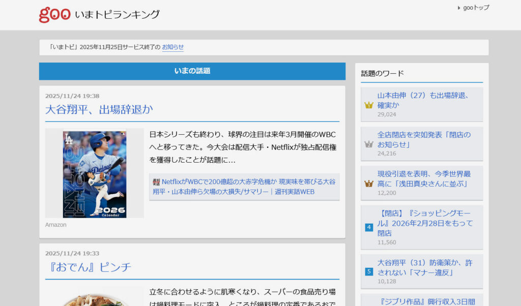 ポータルサイトgooの人気コンテンツ「いまトピランキング」が2025年11月25日をもって終了となることがgoo公式ホームページで発表された。