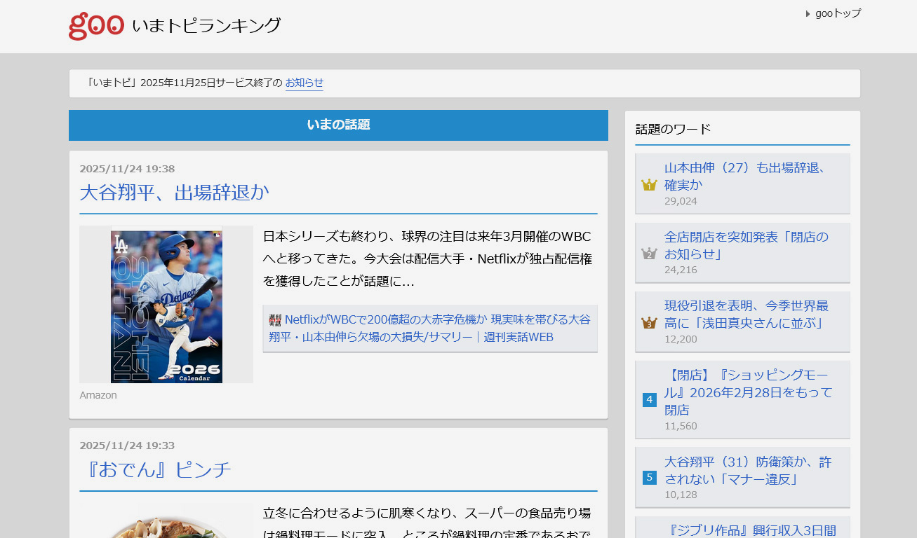 ポータルサイトgooの人気コンテンツ「いまトピランキング」が2025年11月25日をもって終了となることがgoo公式ホームページで発表された。