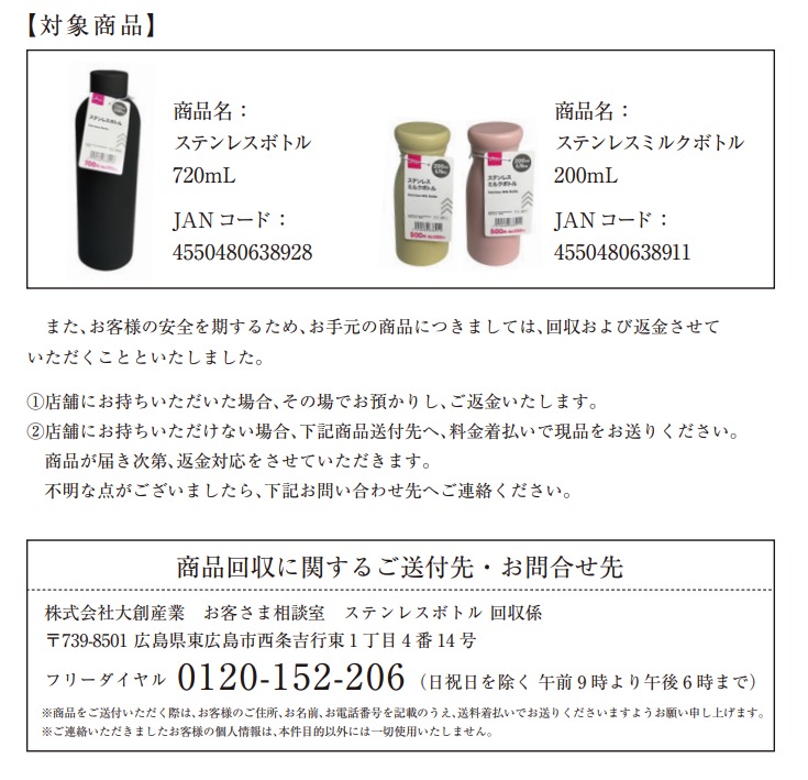 株式会社大創産業 お客様相談室 ステンレスボトル 回収係